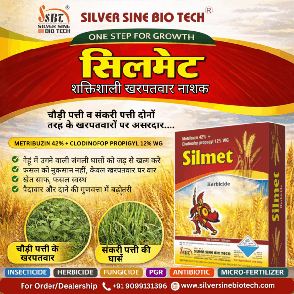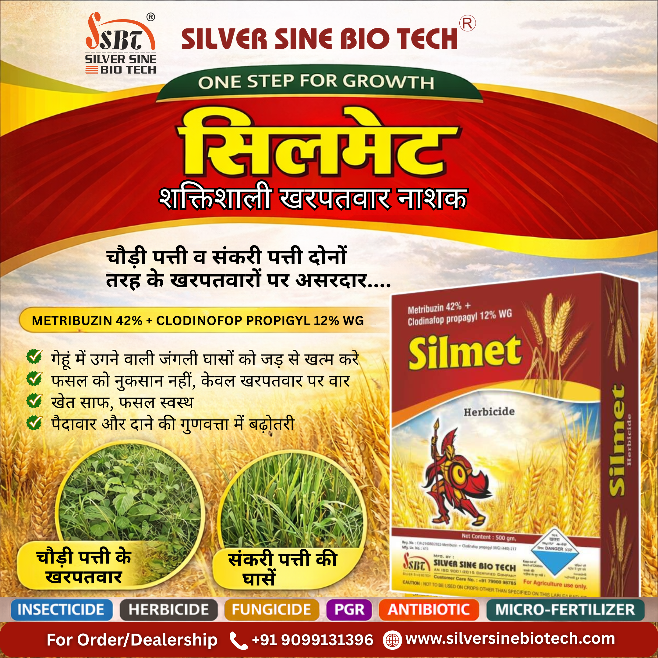DESCRIPTION: SILMET is a broad-spectrum, selective herbicide specially formulated for wheat crops. It effectively controls both grassy and broadleaf weeds that compete with wheat plants for nutrients and moisture. The combination of Metribuzin and Clodinofop Propagyl provides both contact and systemic action, ensuring complete and lasting weed control.