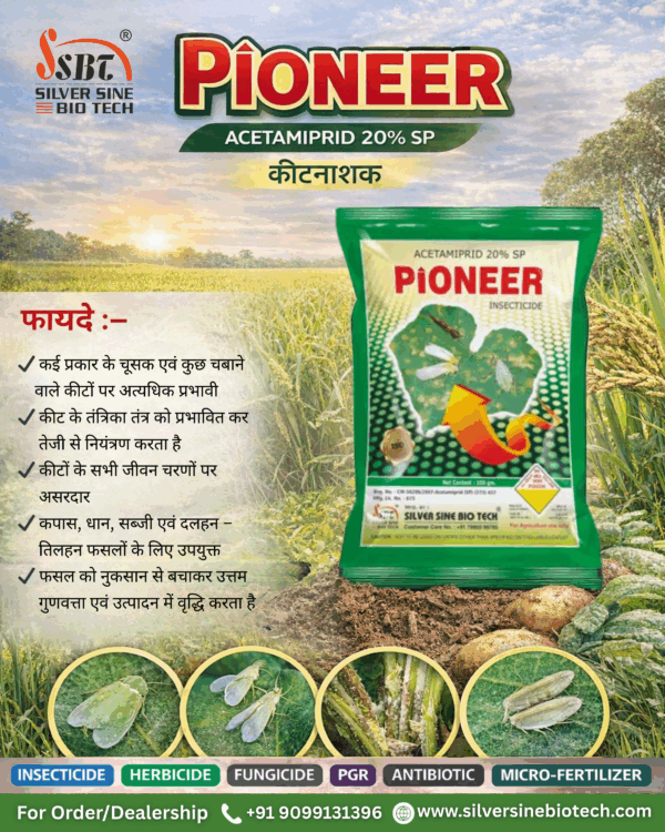 Description: PIONEER is a Soluble Powder formulation containing 20% of the active ingredient Acetamiprid. Acetamiprid 20% SP is a highly effective systemic insecticide for the control of aphids, jassids, and whiteflies in cotton crop.