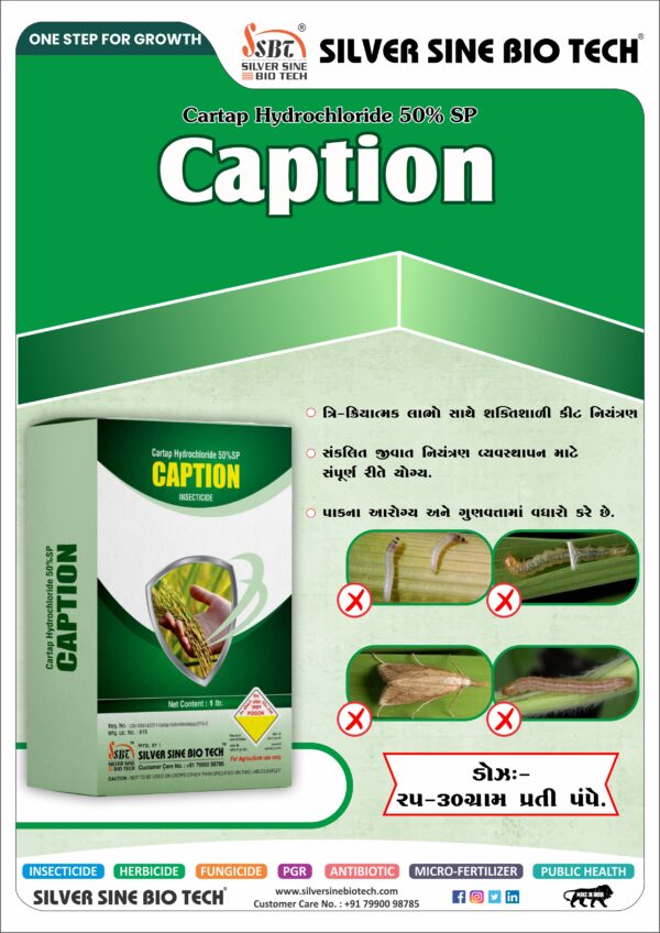 DESCRIPTION: CAPTION (Cartap Hydrochloride 50% SP) is an insecticide of the nereistoxin analogue group, which gives effective control of insect pests. CAPTION SP has remarkable capacity to control biting, chewing, and sucking types of insects. It is a suitable insecticide for Integrated Pest Management (IPM).