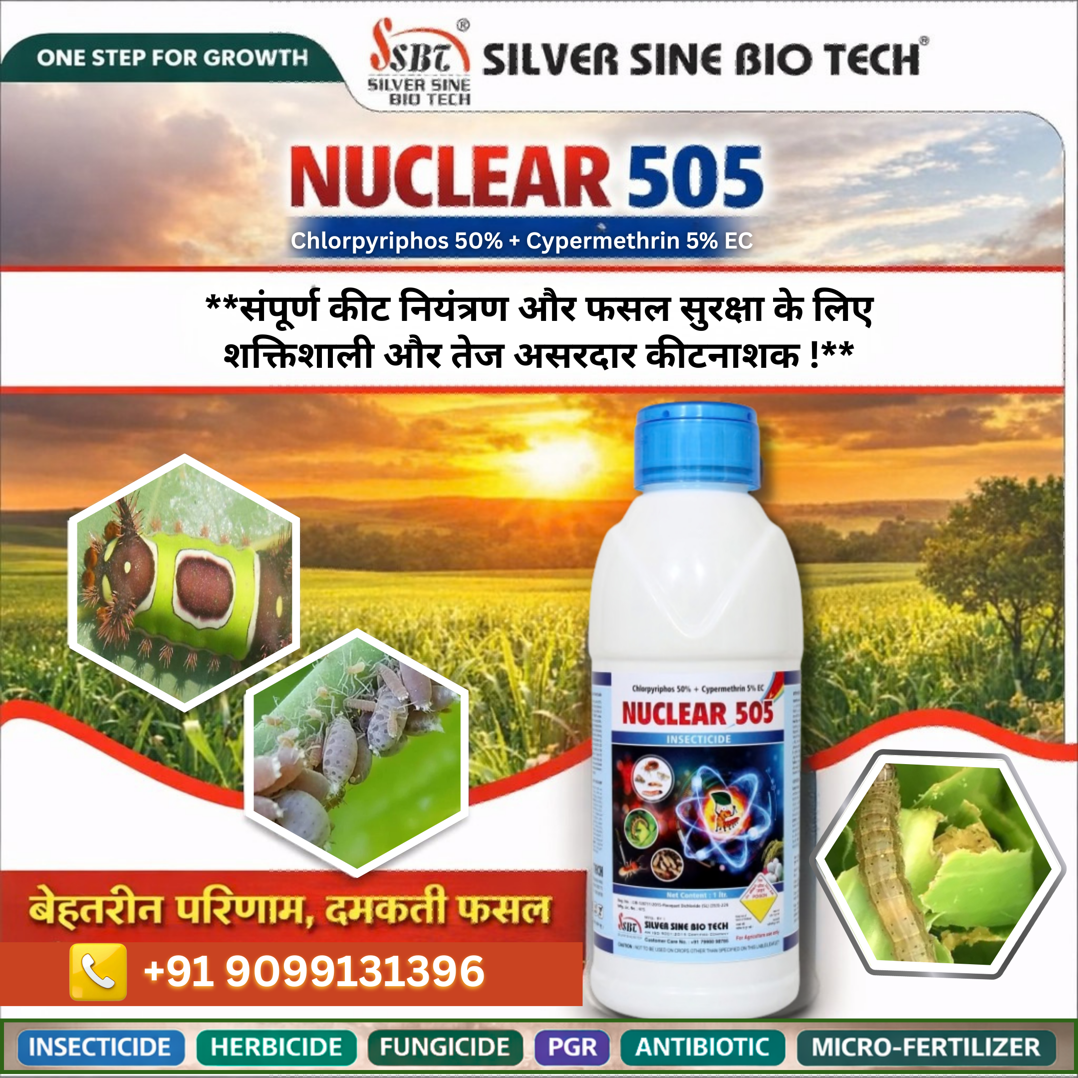 • NUCLEAR 505 (Chlorpyriphos 50% + Cypermethrin 5% EC), due to higher persistence on the leaf surface, is effective for a longer duration.