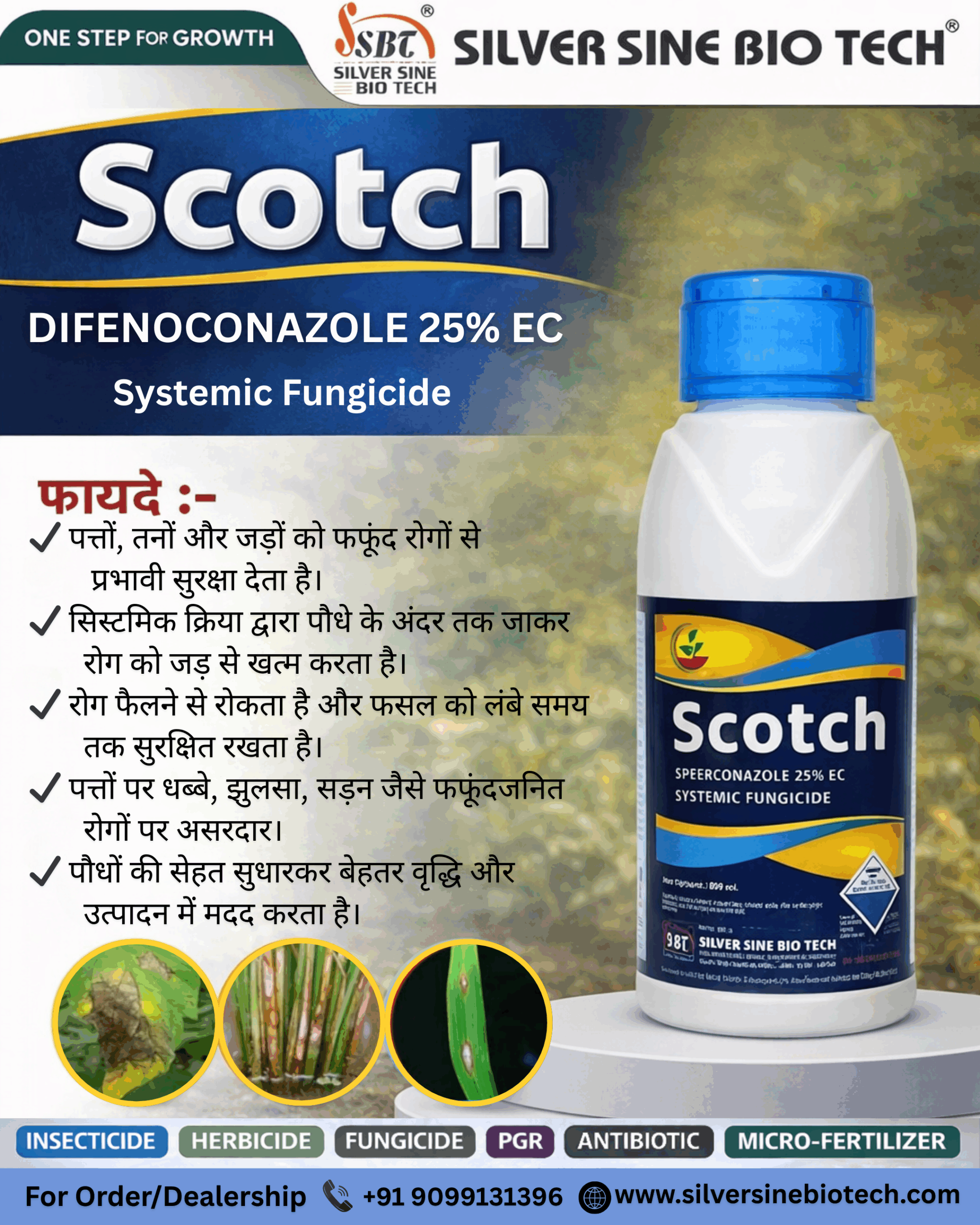 DESCRIPTION: Scotch is a broad-spectrum systemic fungicide containing Difenoconazole 25% EC, highly effective in controlling a wide range of fungal diseases in various crops. It provides both protective and curative actions, ensuring long-lasting disease control and healthier plant growth. It is highly recommended for use in fruits, vegetables, and cereals to prevent fungal infections like leaf spot, rust, and powdery mildew.