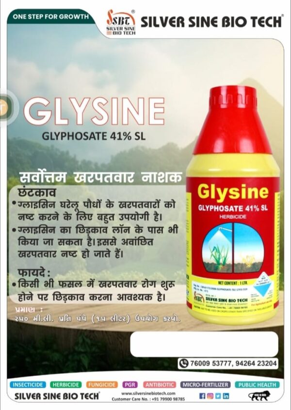 DESCRIPTION: GLYSINE (GLYPHOSATE 41% SL) belongs To Most Popular Organophosphorus Group Of Herbicide. GLYSINE Is Very Effective Against Grassy And Broad Leaved Weeds In Non Cropped Area As Well As In Vacant Space Of Cropped Area.