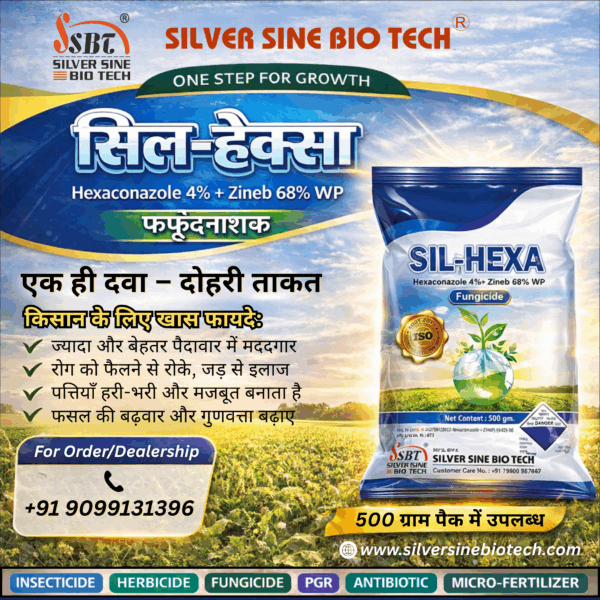 DESCRIPTION: HEXACONAZOLE 4% + ZINEB 68% WP is a broad-spectrum, dual-action systemic and contact fungicide. It provides protective as well as curative control against major fungal diseases in a wide range of crops. The combination ensures strong efficacy against leaf spots, blights, sheath rot, early blight, late blight, fruit rot, anthracnose, and powdery mildew.