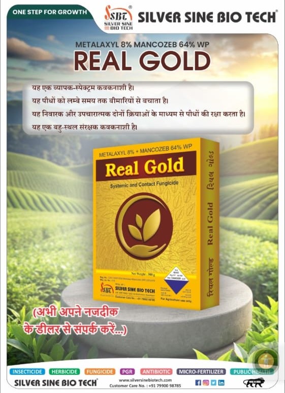 DESCRIPTION: REAL GOLD (METALAXYL 8% + MANCOZEB 64% WP) Dual Action, Broad Spectrum Fungicide Which Controls Diseases By Its Preventive As Well As Curative Action.