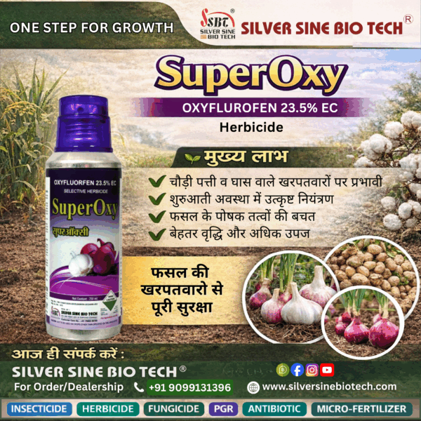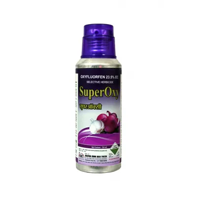 DESCRIPTION: SuperOxy is a selective pre- and post-emergence herbicide containing Oxyfluorfen 23.5% EC, designed to effectively control a wide range of annual broadleaf and grassy weeds in various crops. It provides long-lasting weed suppression and ensures healthy crop establishment. SuperOxy is widely used in onion, garlic, and other field crops to maintain a weed-free environment for better growth and yield.